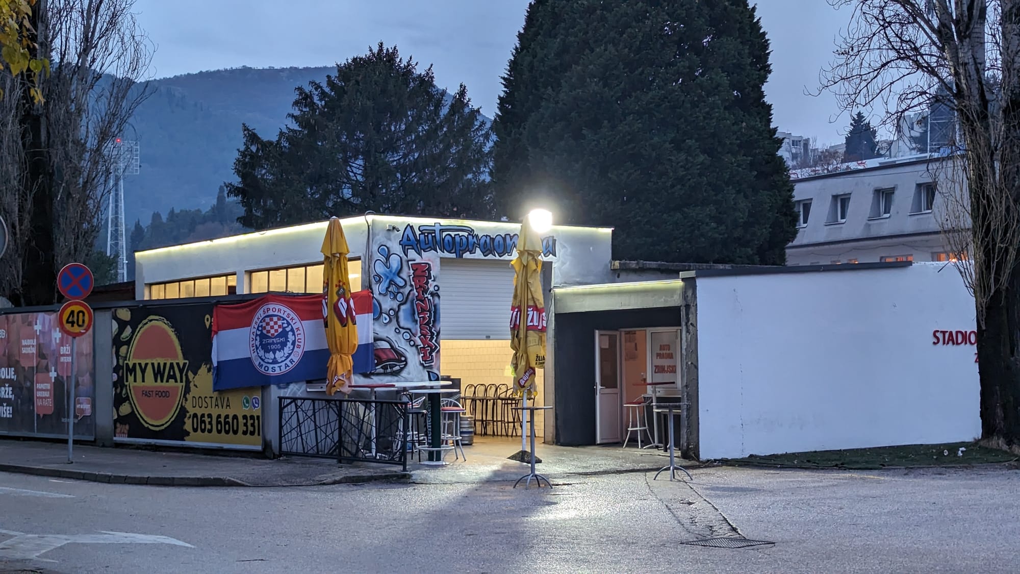 Turns out that it was to his mate Bosko (not his real name either) and the boisterous Zrinjski Ultras bar opposite the stadium. This bar faces a car wash embedded into the corner of the stadium complex, and it converts into a bar that sells hotdogs after the game. That's neat.